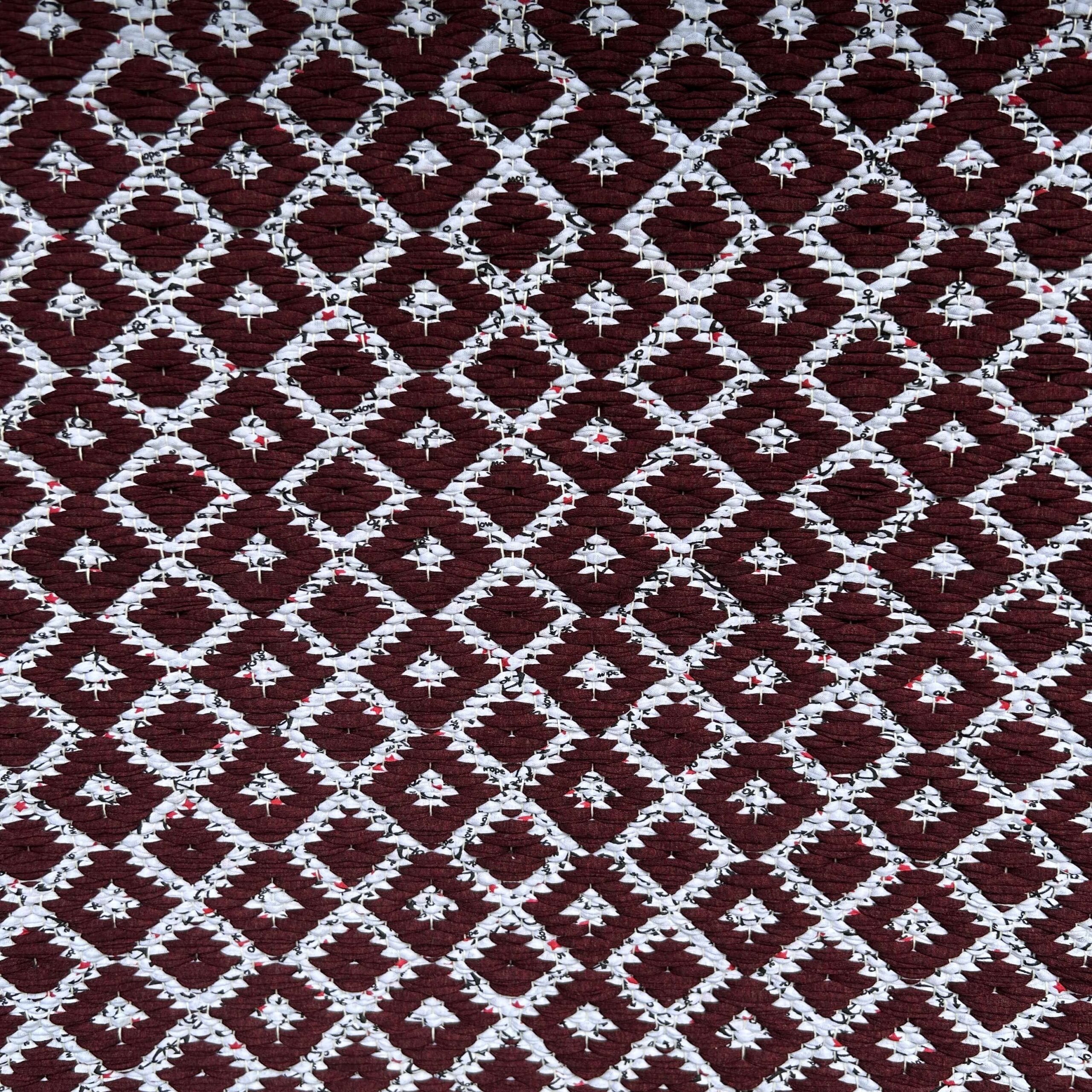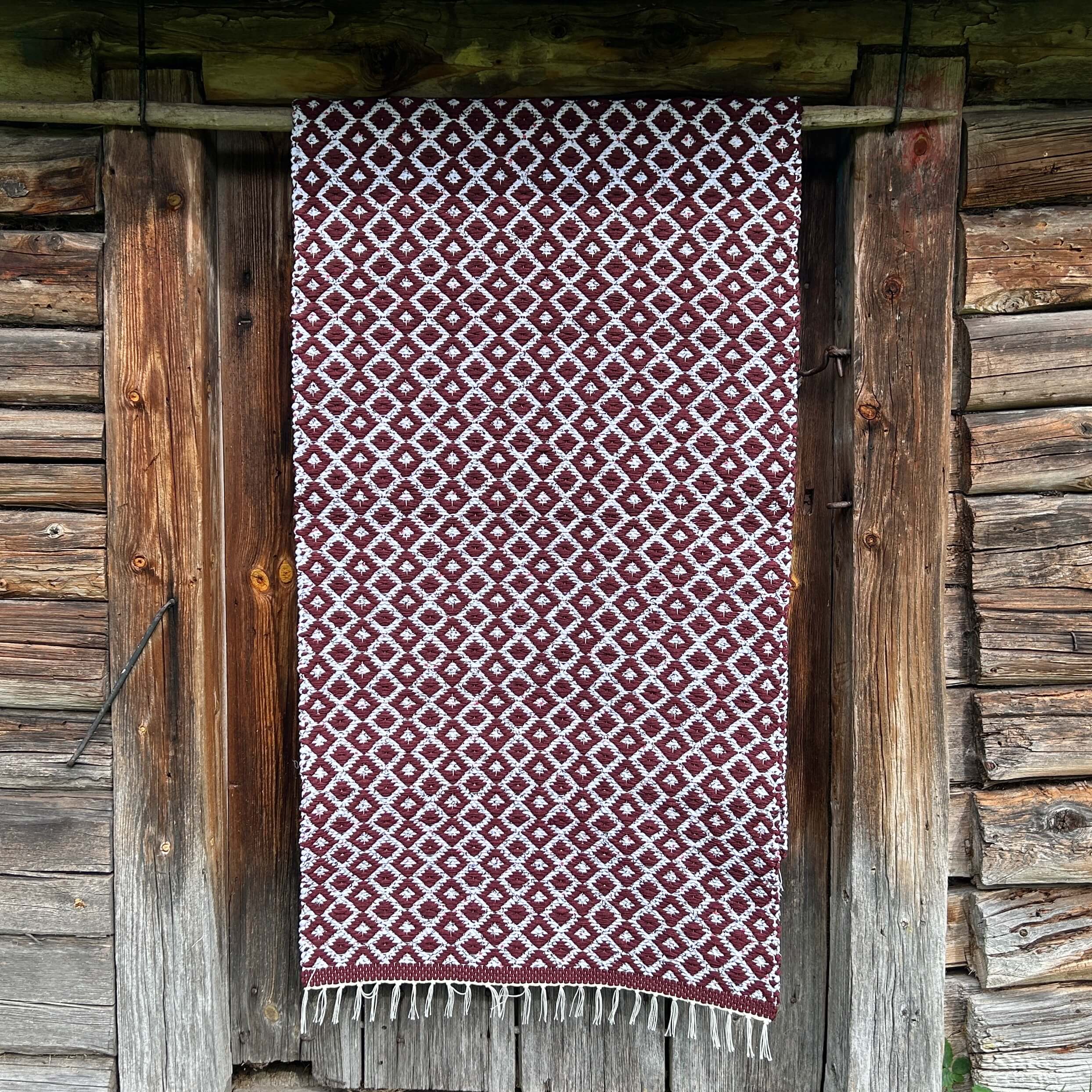 Punase ja valgega kaltsuvaip, mis on käsitsi kangastelgedel erineva koostisega trikotaažiribadest kootud. Unikaalne ja eripärane!