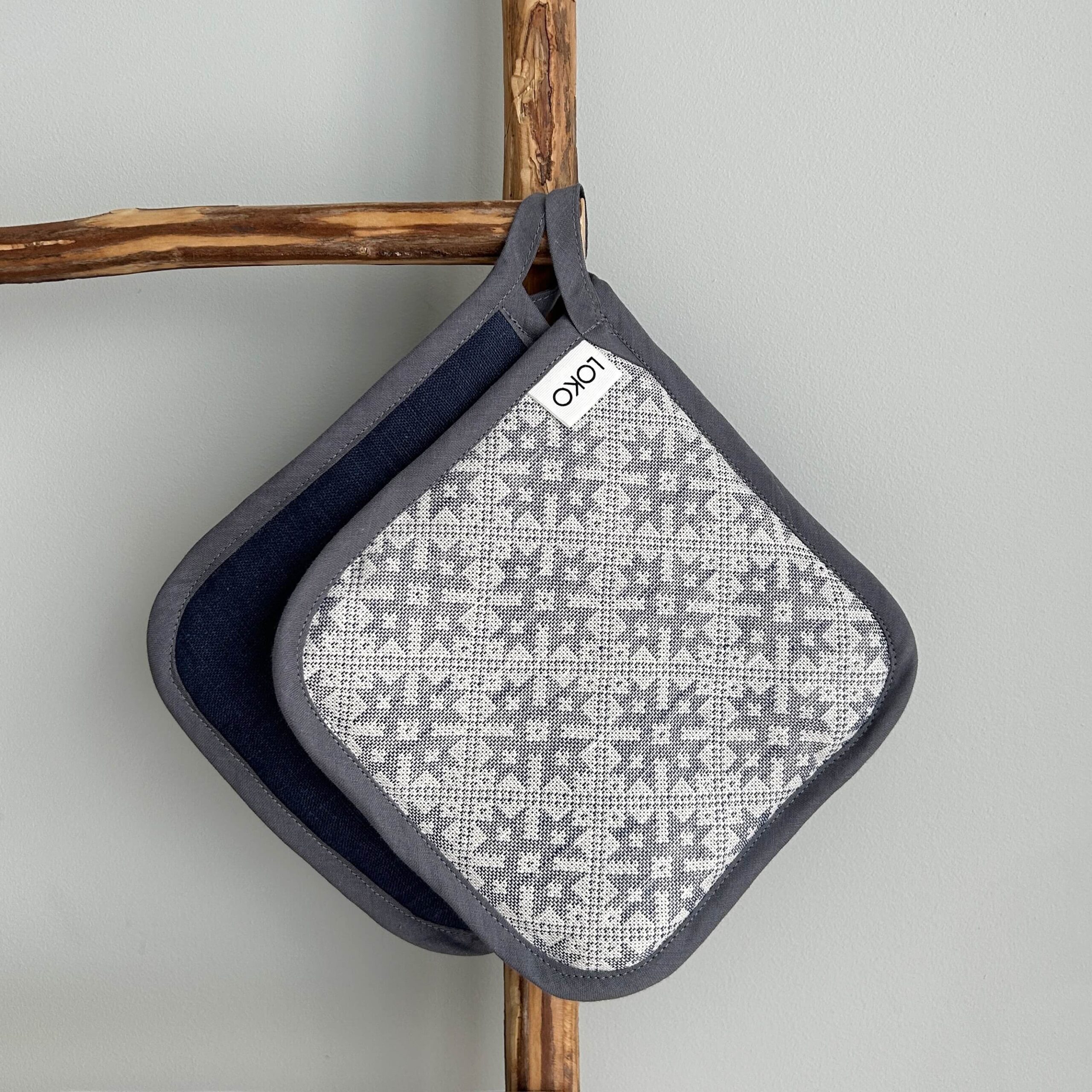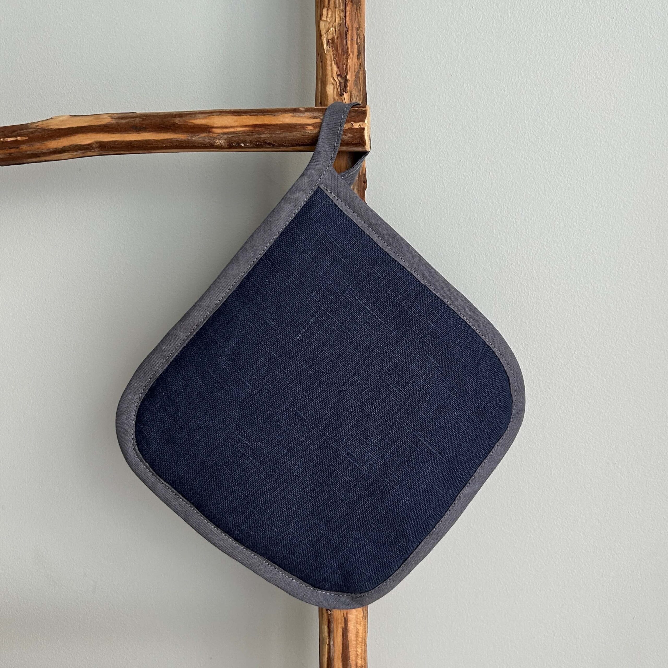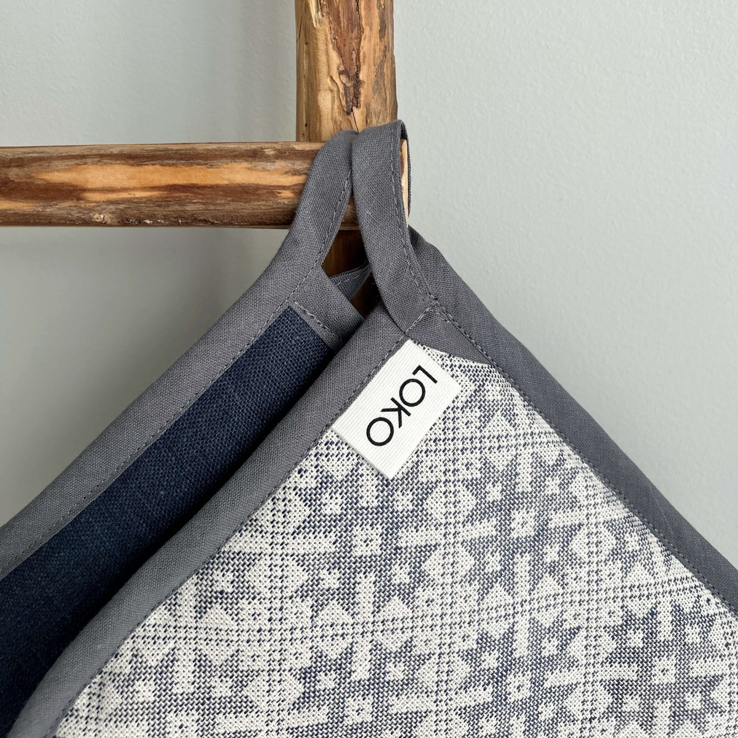 Pajalapi ühte külge kaunistab Pärnumaa kindakirja muster. Teisel pool tumesinine linane kangas.