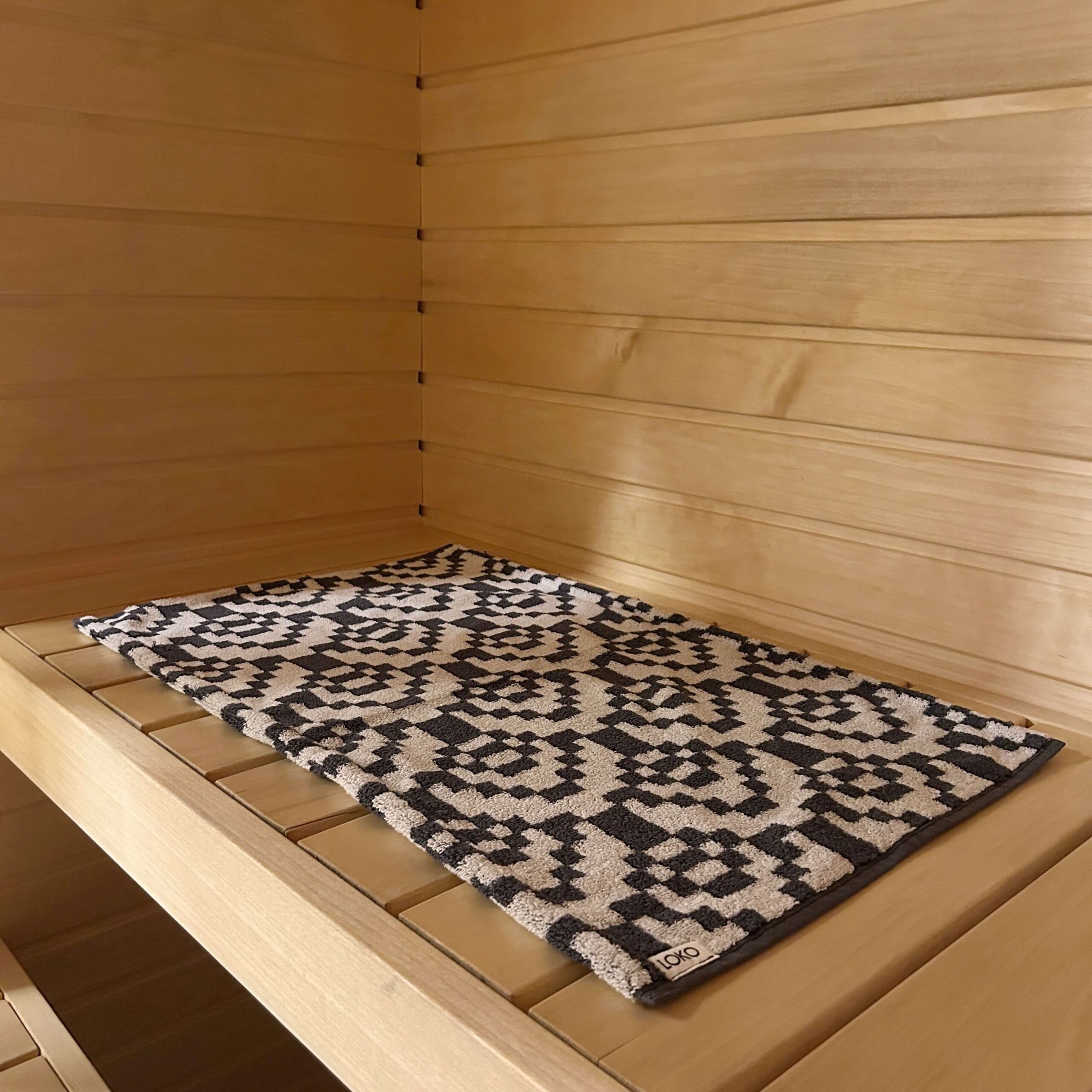 Saunalava istumisalus kaitseb lavalaudu määrdumise eest ja sind selle eest, et kuum ei kõrvetaks. Kangast kaunistab Valgamaa, Otepää kindakirja muster.